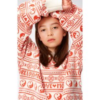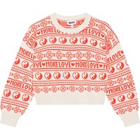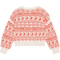 Cremeweißer Strickpullover mit roten Yin- und Yang-Zeichen, Molos Herzklee und dem Text „More Love“. Der Pullover hat einen Rundhalsausschnitt und Strickrippen am Halsausschnitt, an den Ärmeln und am Saum, die für ein schönes Finish sorgen. Der Pullover hat eine lockere Passform und mit dem schönen roten Strickmuster erhält man die Atmosphäre des norwegischen Strickpullovers.