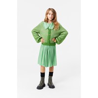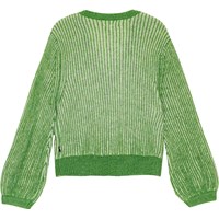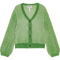Grüner und cremefarbener Cardigan aus einer Mischung aus Wolle. Der Cardigan hat einen gerippten Ausschnitt und eine Knopfleiste mit 4 Knöpfen. Die Ärmel sind lang und mit einem gerippten Bündchen versehen, das den Ärmel sammelt und Volumen hinzufügt. Der Cardigan hat einen einzigartigen Look mit seinem elastischen gerippten Material, das zwischen grün und cremefarben wechselt.