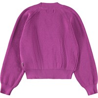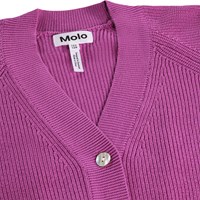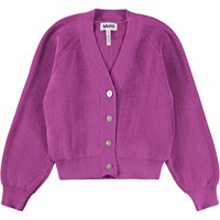 Lila Strickjacke aus weicher Bio-Baumwolle. Die Strickjacke hat eine lockere Passform, einen V-Ausschnitt, Knöpfe und gerippte Kanten an den Ärmeln, am Saum und am Hals.