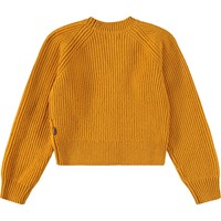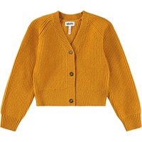 Dunkelgelber Cardigan aus weicher gestrickter Wolle. Der Cardigan hat einen gerippten Ausschnitt und eine Leiste mit 3 Holzknöpfen. Die Ärmel sind lang und enden mit einem gerippten Saum. Er hat einen klassischen und lockeren Look mit Raglanärmeln und einem gerippten Bund.