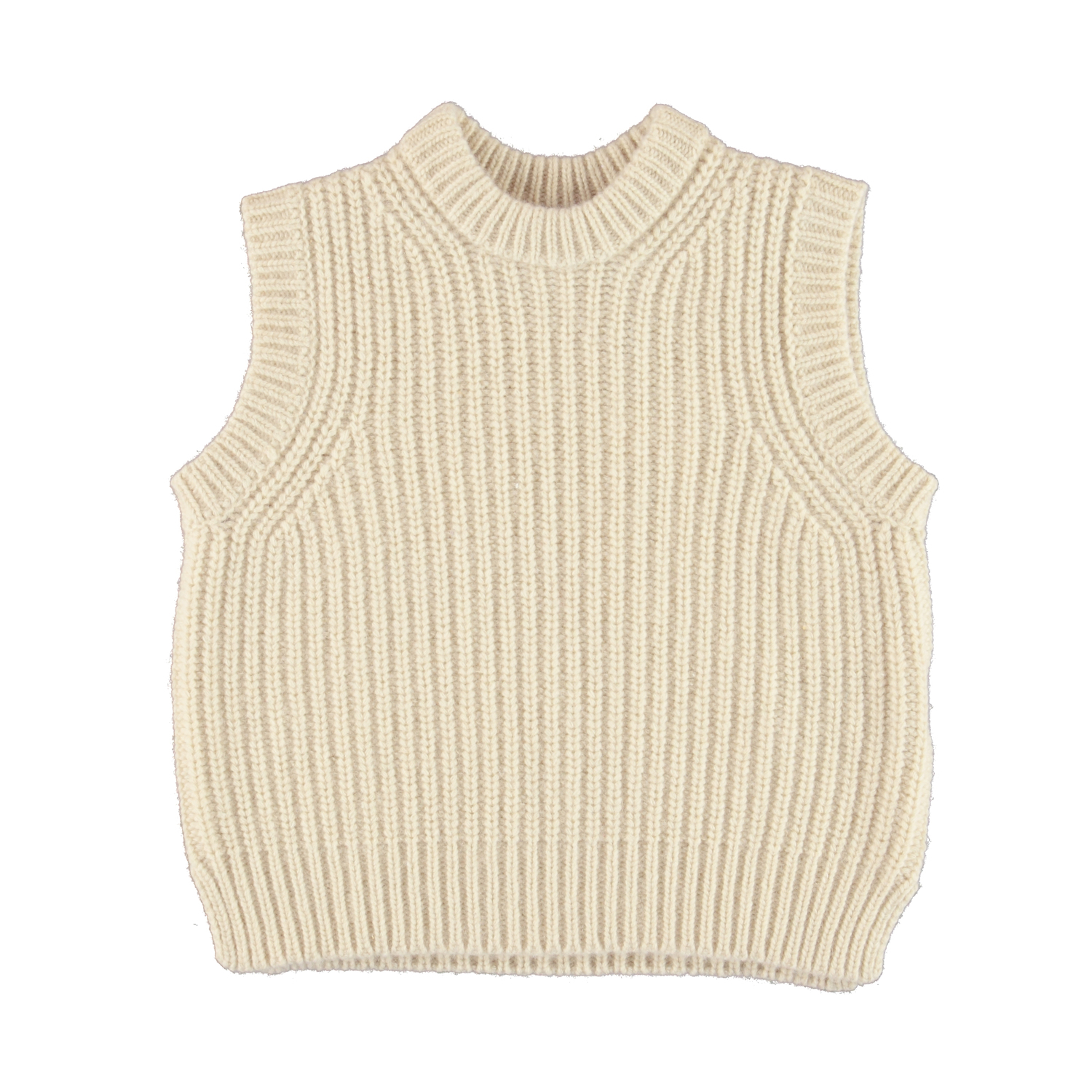 Gilberte ist eine leichte Strickweste. Die Weste hat einen Rundhalsausschnitt und kleine Schlitze an den Seiten.