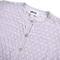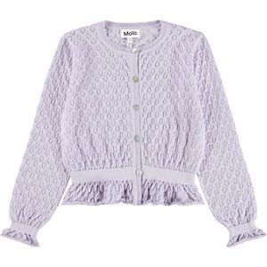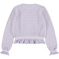 Femininer lila Cardigan aus Öko-Baumwolle. Dieser Cardigan hat ein schönes Blumenmuster aus Spitze, gerippte Kanten an Taille und Ärmeln für eine gute Passform sowie einen leicht gerafften Abschluss an Ärmeln und Taille.
