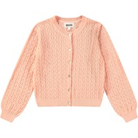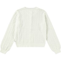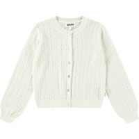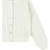 Weißer Strick-Cardigan aus weicher Öko-Baumwolle mit einem schönen Spitzenmuster. Der Cardigan hat eine reguläre Passform, Perlmuttknöpfe auf der Vorderseite und gerippte Kanten am Ausschnitt, an den Ärmeln und am unteren Saum des Cardigans.