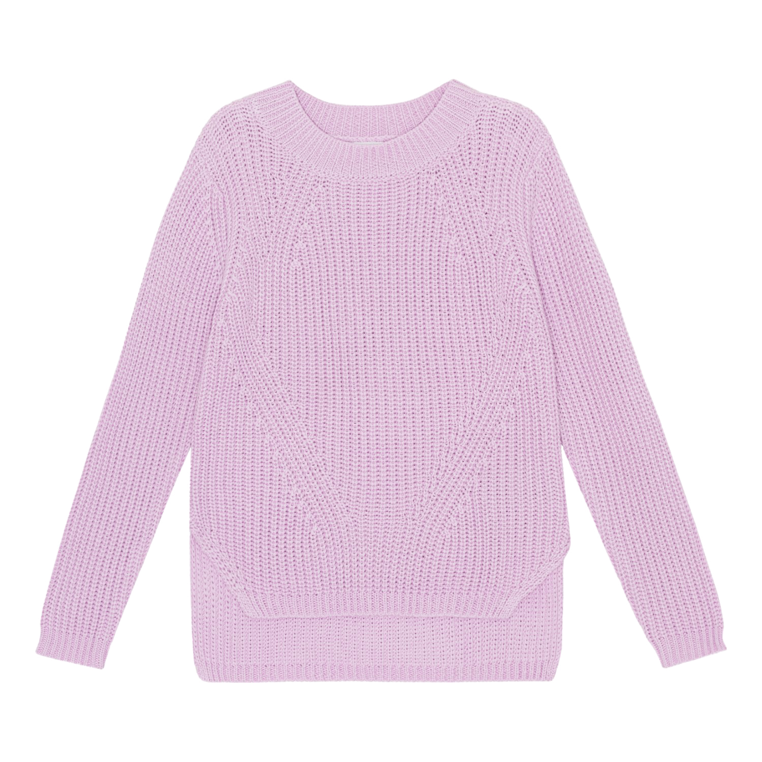 Pastellvioletter Langarm-Strickpullover aus weicher Öko-Baumwolle. Das Muster ist im Rippenstrick mit feinen Ein- und Aussen gestrickt und hat hinten eine Überlänge und Schlitze an den Seiten.