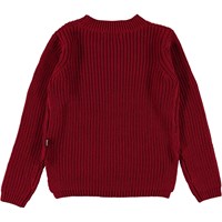 Gillis ist ein dunkelroter Baumwolle-Strickpullover mit langen Ärmeln. Der Pullover hat einen Halsausschnitt und ein feines Strickmuster. Der Pullover besteht aus 100% Öko-Baumwolle.