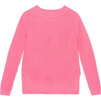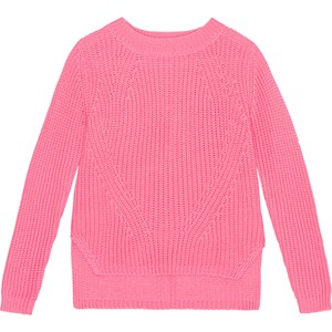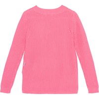 Rosafarbener Langarm-Strickpullover aus weicher Öko-Baumwolle. Das Muster ist im Rippenstrick mit feinen Ein- und Aussen gestrickt und hat hinten eine Überlänge und Schlitze an den Seiten.