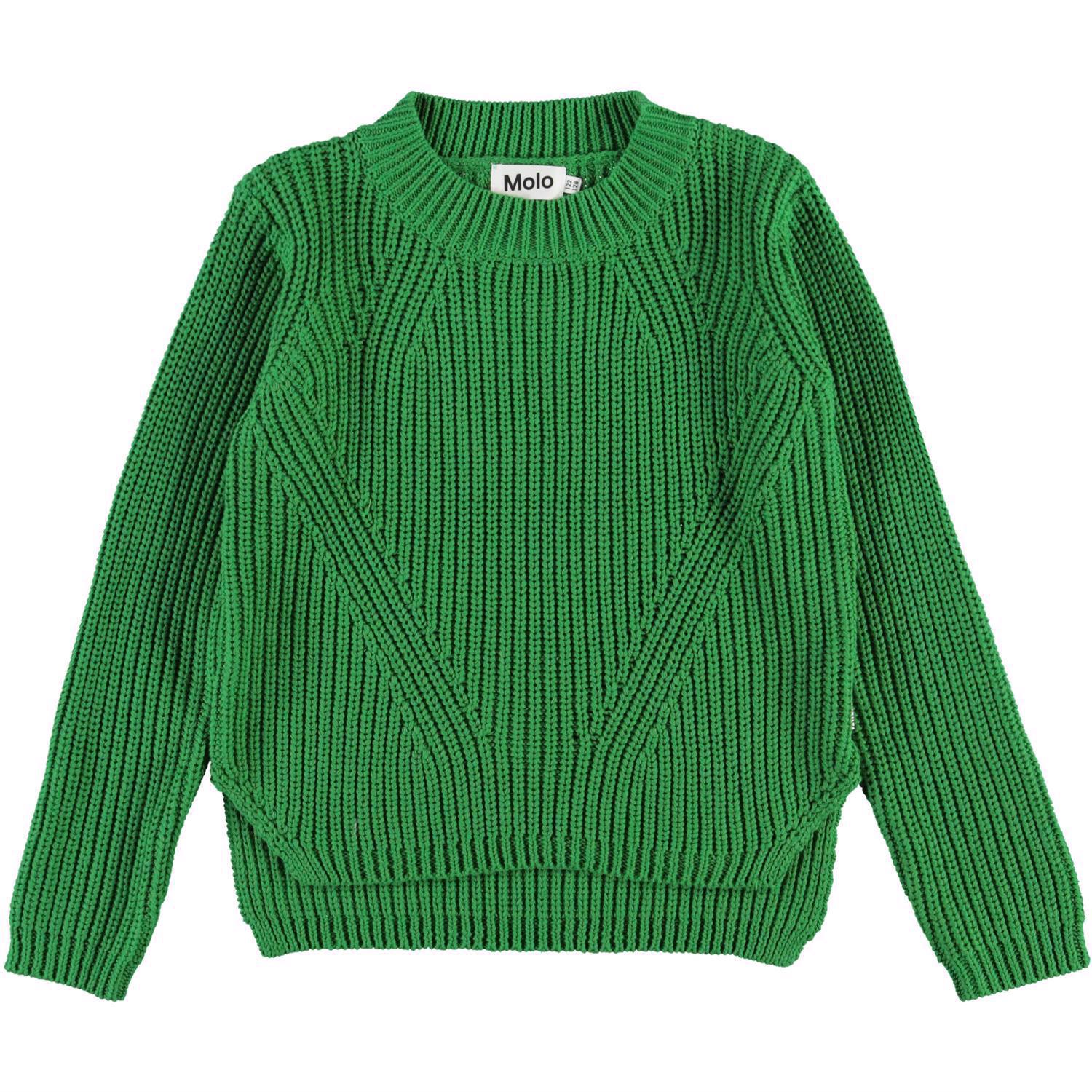 Gillis ist eine grüne Baumwollstrickbluse mit langen Ärmeln. Die Bluse hat einen Rundhalsausschnitt und ein feines Strickmuster. Die Bluse ist aus Ökologisch zertifizierter Baumwolle.