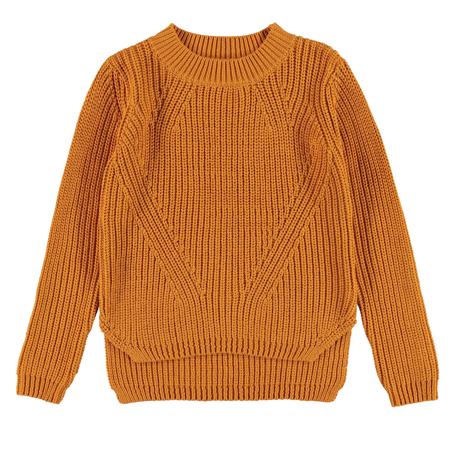 Gillis ist ein oranger Baumwollstrickpullover mit langen Ärmeln. Der v hat einen Rundhalsausschnitt und ein feines Strickmuster.