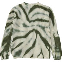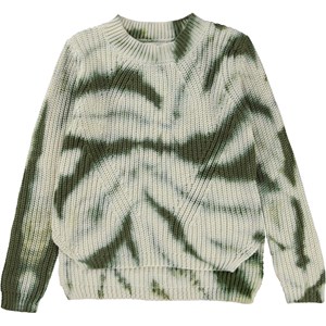 Grün-weißer Strickpullover mit Batikdruck. Der Druck ist eine abstrakte Version von Batik und erinnert an positiven Energien, die zwischen uns fließen. Dieser Strickpullover besteht aus 100% Baumwolle und ist in einem feinen Muster gestrickt. Er ist hinten länger als vorne, hat einen Rundhalsausschnitt mit Rippbündchen, lange Ärmel mit Rippbündchen, Rippbündchen an der Hüfte und eine normale Passform.