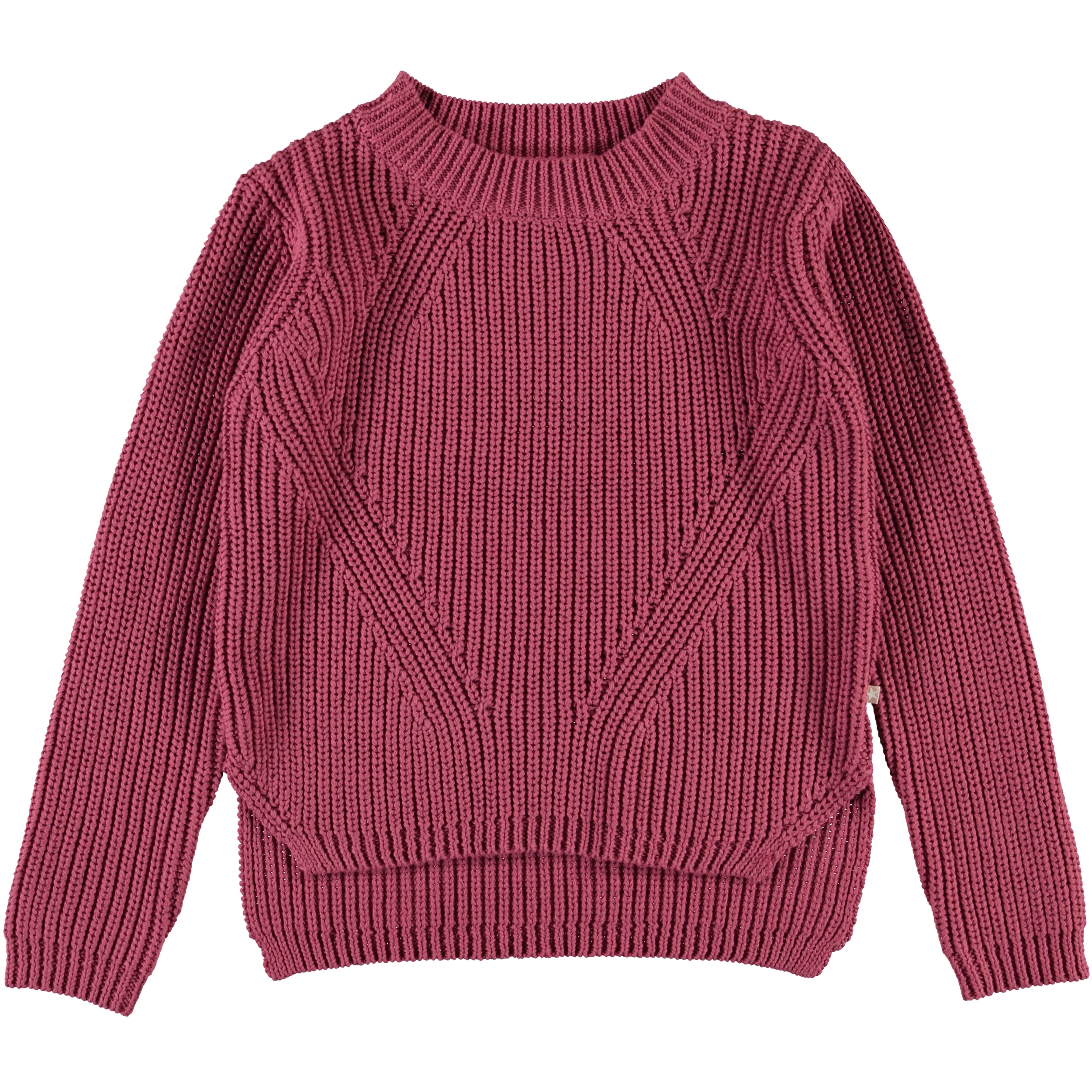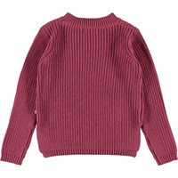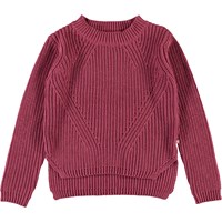 Gillis ist eine himbeerfarbene Strickbluse aus Baumwolle mit langen Ärmeln. Die Bluse hat einen Rundhalsausschnitt und ein feines Strickmuster.