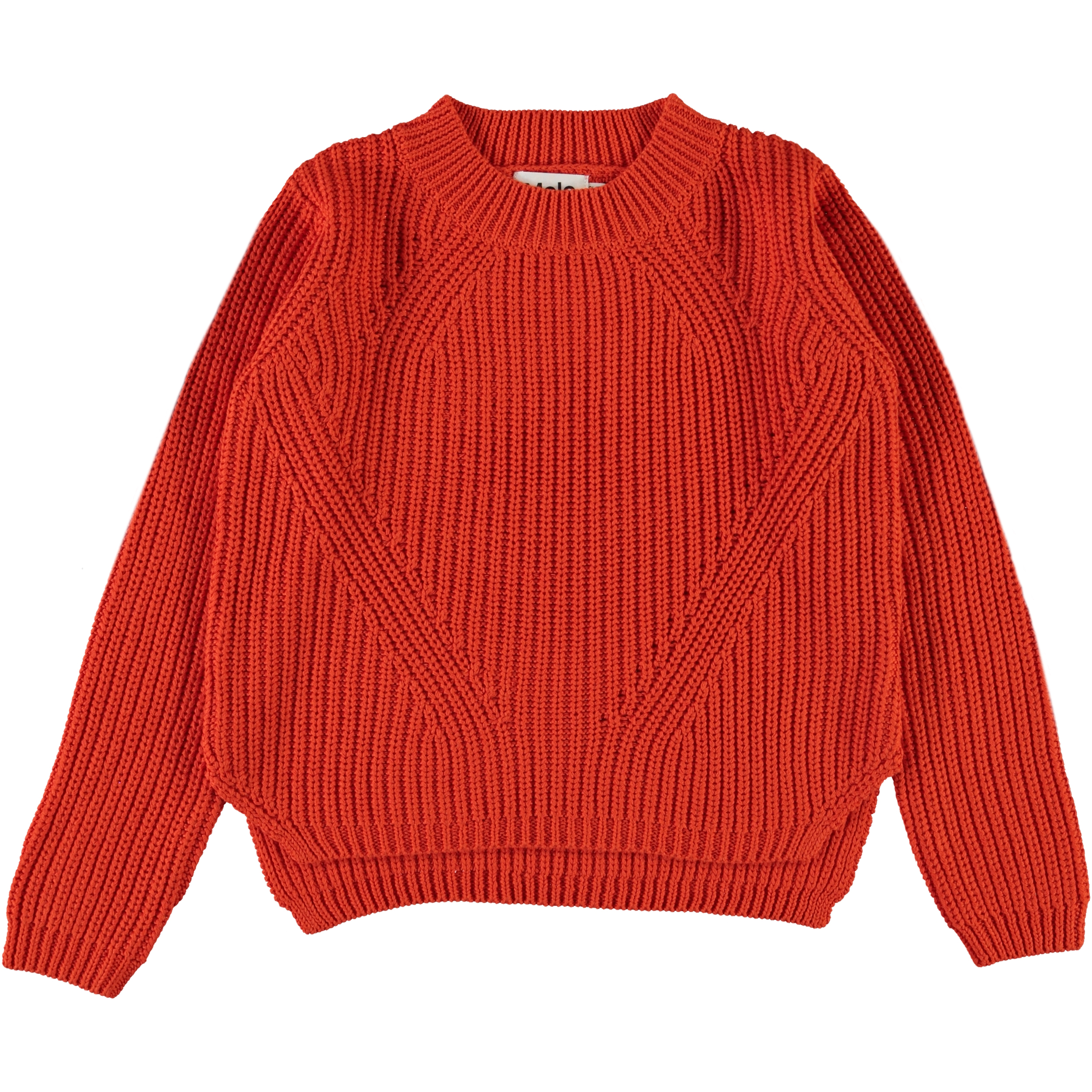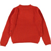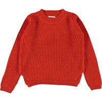 Gillis ist eine orangerote Strickbluse aus Baumwolle mit langen Ärmeln. Die Bluse hat einen Rundhalsausschnitt und ein feines Strickmuster.