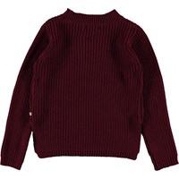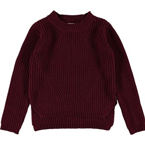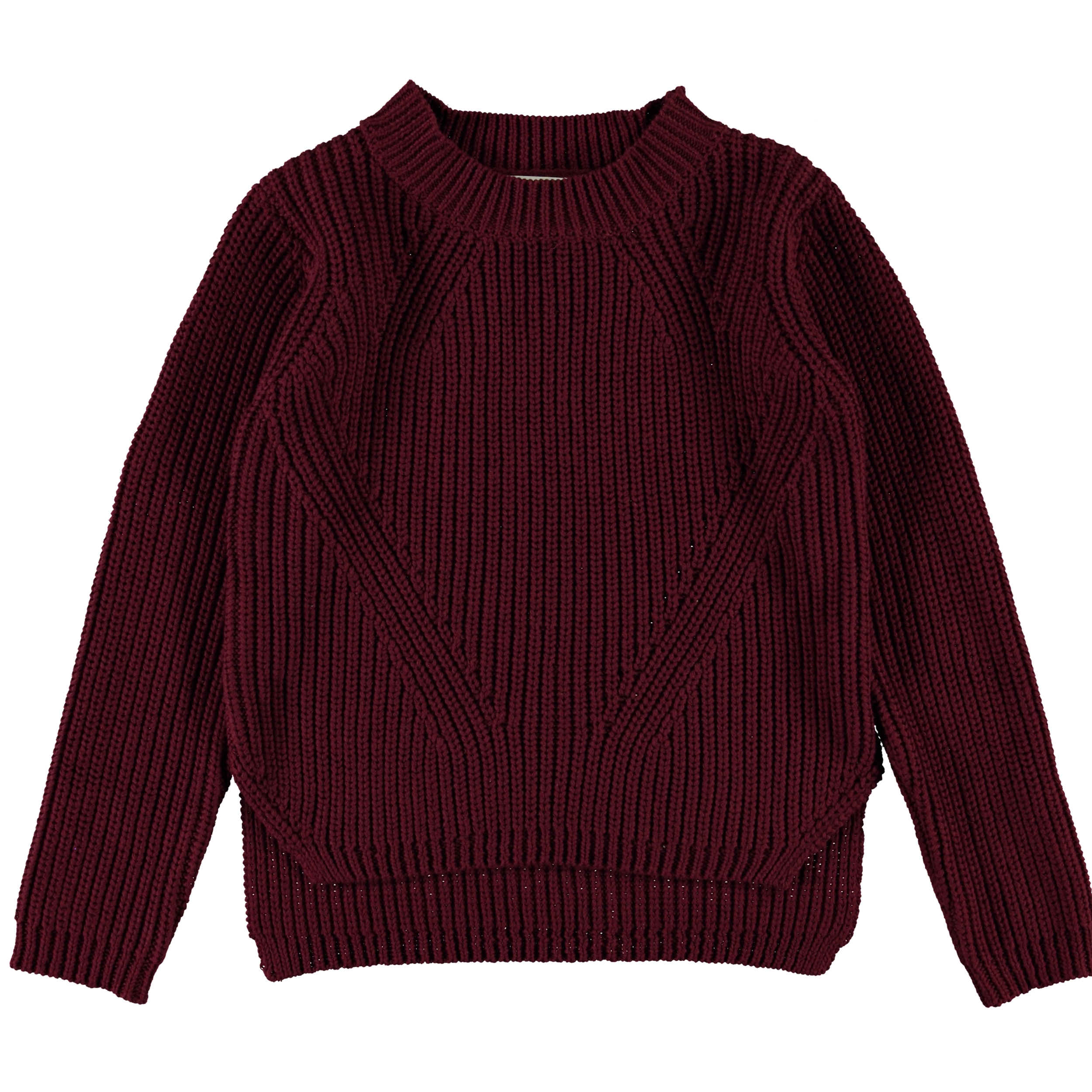 Gillis ist eine dunkelrote Strickbluse aus Baumwolle mit langen Ärmeln. Die Bluse hat einen Rundhalsausschnitt und ein feines Strickmuster.