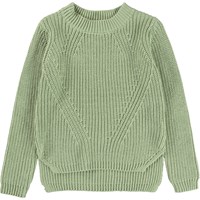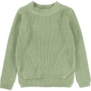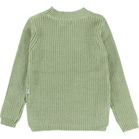 Gillis ist ein grüner Baumwollstrickpullover mit langen Ärmeln. Der Pullover hat einen Rundhalsausschnitt und ein feines Strickmuster.