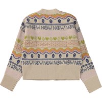 Wollweißer Strickcardigan mit nordisch inspiriertem Muster. Das Muster auf dem Strickcardigan besteht aus kleinen lächelnden Gesichtern, Herzen und Peace-Zeichen sowie der Botschaft „Peace Now“ in verschiedenen Farben. Dieser Strickcardigan ist aus einer weichen und warmen Wollmischung gefertigt, hat einen V-Ausschnitt, einen Knopfverschluss auf der Vorderseite, lange Ärmel mit Rippmuster, Rippbündchen an der Hüfte und eine lockere Passform. Perfekt als zusätzliche Schicht an kälteren Tagen.