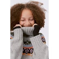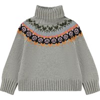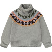 Hellgrauer Melange-Strickpullover mit Stehkragen und Muster. Das Muster verläuft von vorne nach hinten und ist von nordischen Stricktraditionen inspiriert. Es bildet einen grafischen Kragen auf dem Shirt, der aus Herzen, Peace-Zeichen und lächelnden Gesichtern in verschiedenen Farben besteht. Dieser Strickpullover ist aus einer weichen Woll/Acryl-Mischung gefertigt, hat einen hohen Kragen in Rippstrik, einen Raglanschnitt, lange Ärmel mit Rippbündchen, Rippbündchen an der Hüfte und eine lockere Passform. Perfekt für die kälteren Tage.