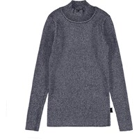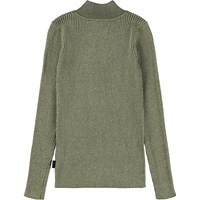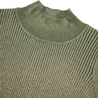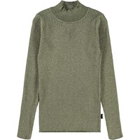 Grüner Rippstrickpullover aus Baumwolle mit Metallfaden für einen schönen Schimmereffekt. Der Pullover hat einen hohen Kragen und lange Ärmel.