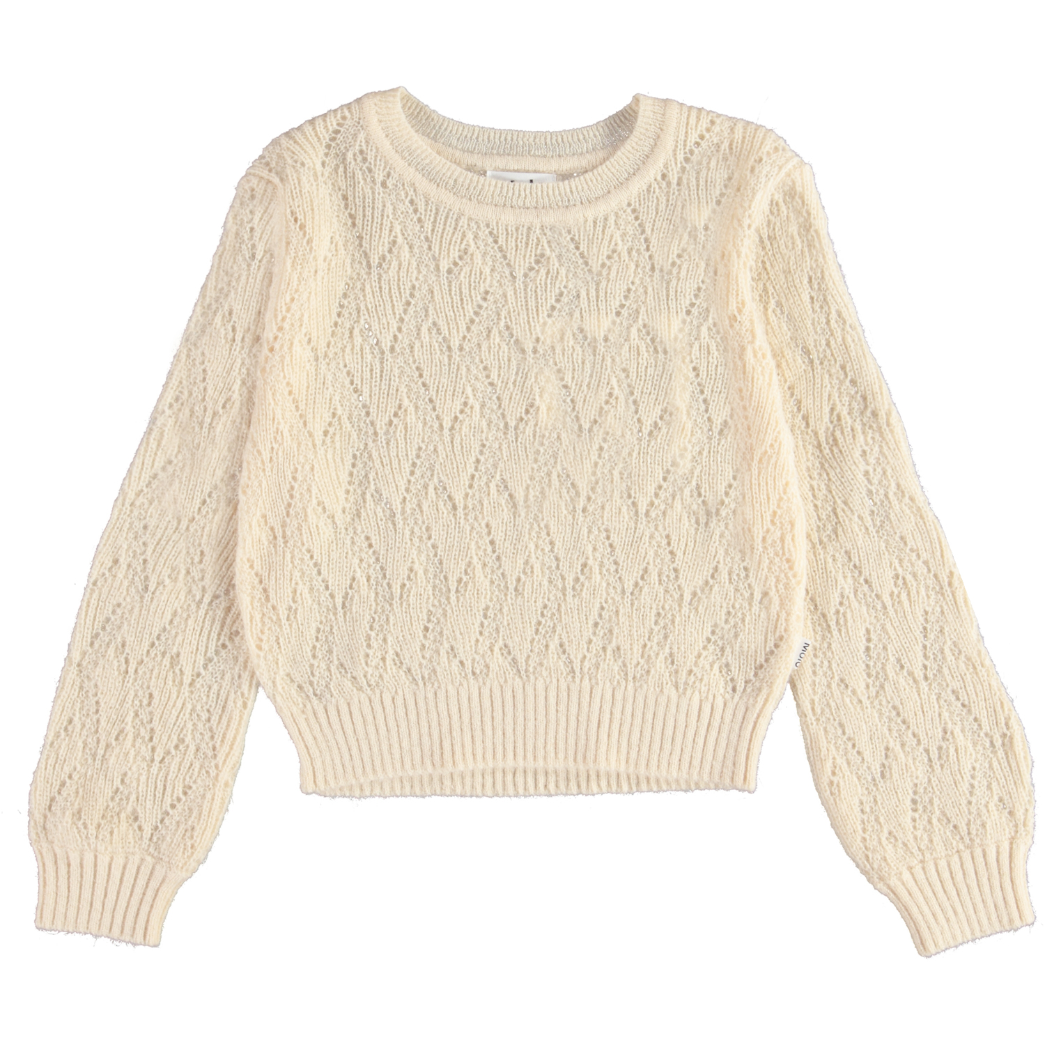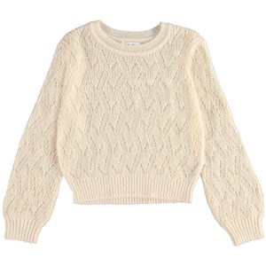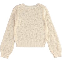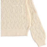 Ginger ist eine helle Strickbluse mit feinem Lochmuster und glockenförmigen Ärmeln.