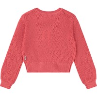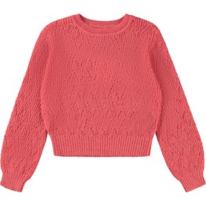 Pinkfarbener Strickpullover mit Lochmuster. Dieser Strickpullover aus einer Alpaka-Woll/Woll-Mischung hat ein feines Lochmuster, lange Ärmel mit Volumen, einen Rundhalsausschnitt mit Rippbündchen, Rippbündchen an Ärmel und Hüfte und eine normale Passform. Die perfekte Strickware für den Alltag.