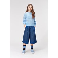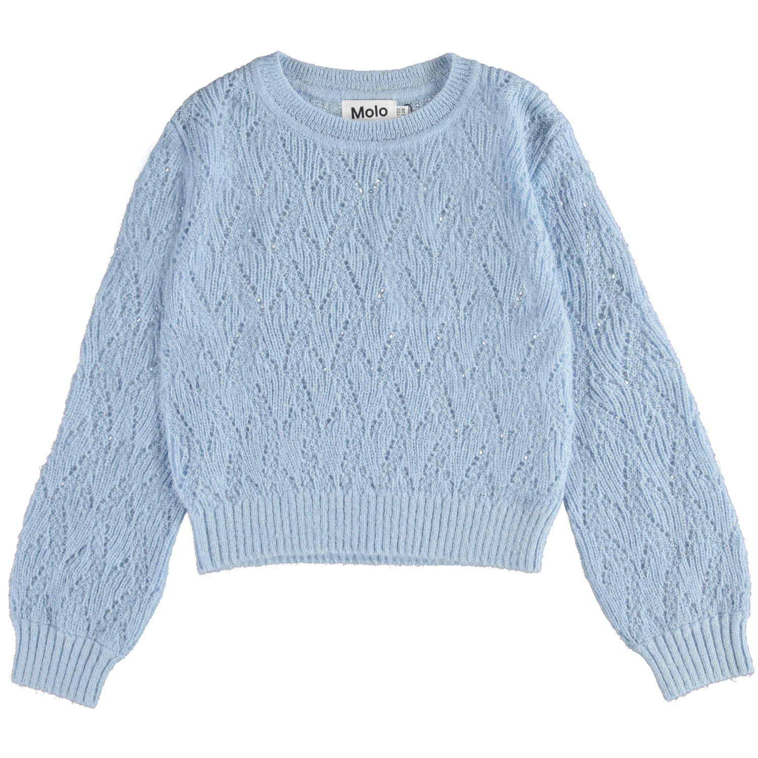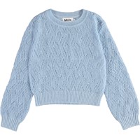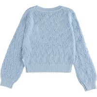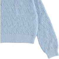 Ginger ist ein langärmeliger, hellblauer, dünner Strickpullover. Ginger ist mit feinem Lochmuster gestrickt und hat Rippkante an Hals, Handgelenken und Hüften.