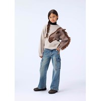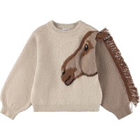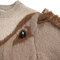 Brauner Wollpullover. Der Pullover hat ein Pferdemotiv gestrickt auf dem Ärmel und der Vorderseite. Die Mähne des Pferdes ist am Ärmel gefranst. Der Pullover hat Ballonärmel und gerippte Kanten am Hals, den Ärmeln und der Taille.
