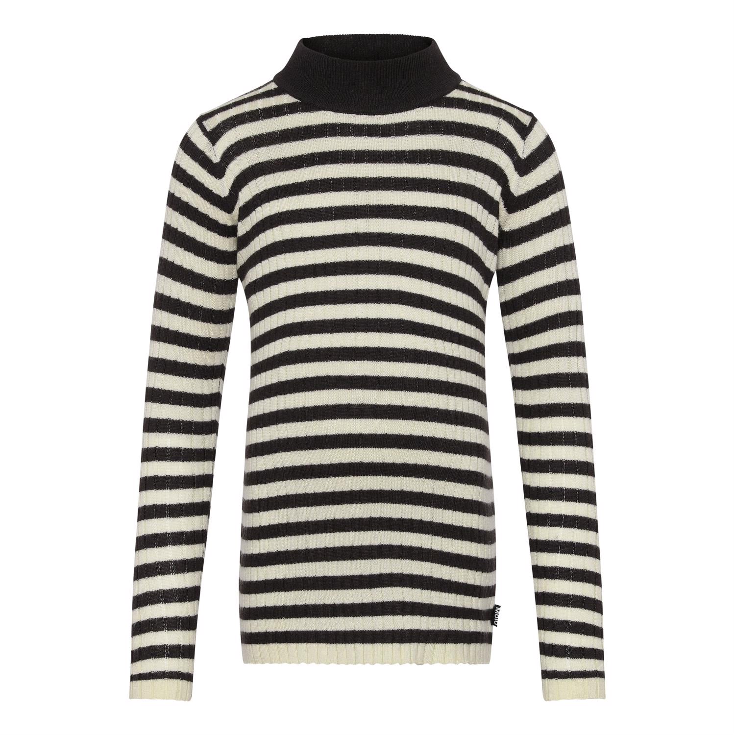 Gitte ist ein schwarz-weiß gestreifter Strick mit hohem Hals und feinem Rippmuster. Der Pullover ist schön weich, da er Kaschmir enthält.