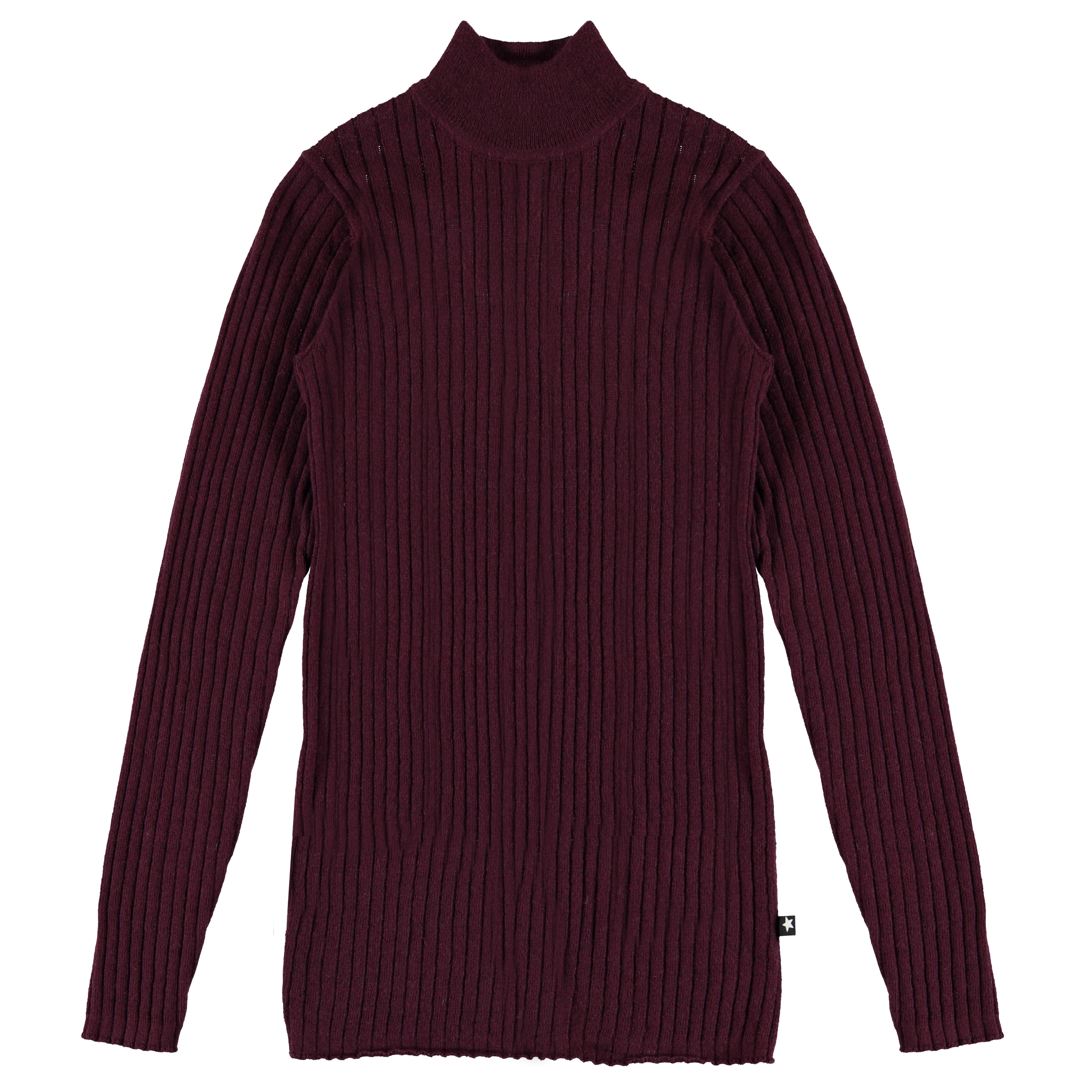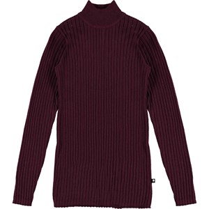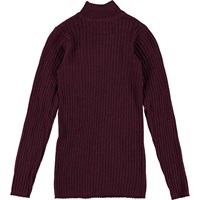 Gitte ist eine dunkelrote, dünne Strickbluse mit hohem Hals.