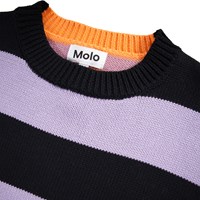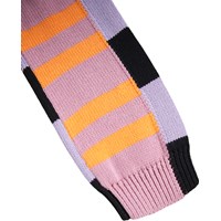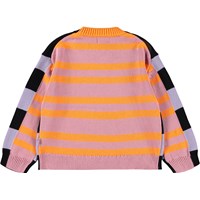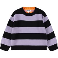 Baumwollpullover mit Streifen. Der Pullover hat schwarze und lila Streifen vorne sowie lila und orangefarbene Streifen hinten. Gerippte Abschlüsse am Ausschnitt, an den Ärmeln und am Saum.
