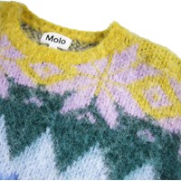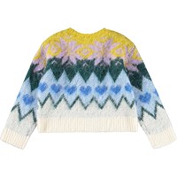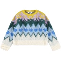 Bunt gestrickter Pullover aus einer Alpakawollmischung mit grafischem Muster. Der Strick ist flauschig und hat ein schönes Muster, inspiriert von nordischen Designs. Der Pullover hat gerippte Abschlüsse am Hals, an den Ärmeln und am Saum.