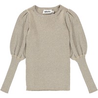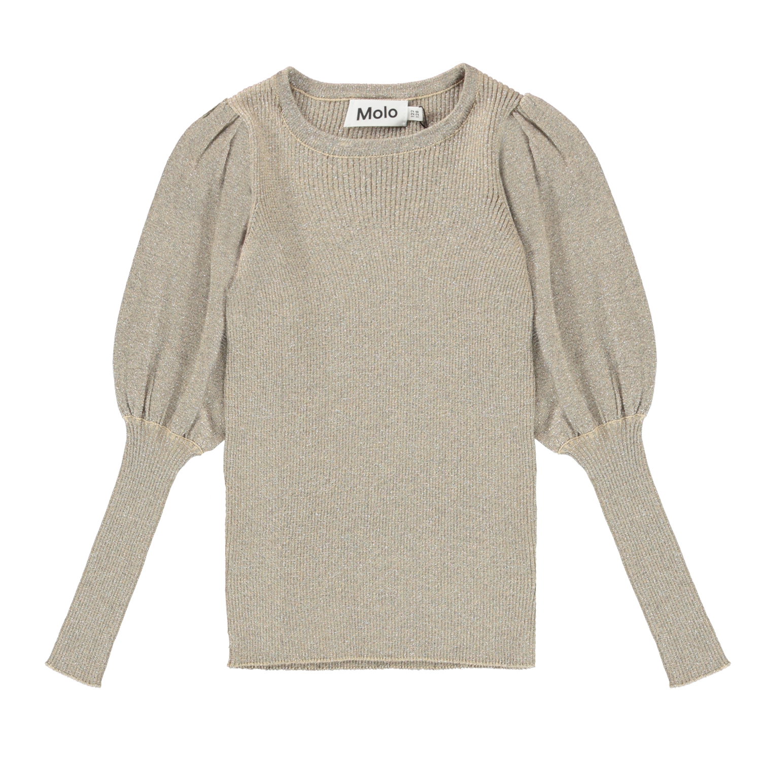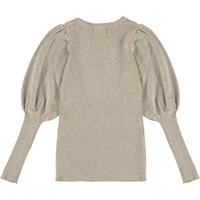 Glenda ist eine hellgraue Bluse mit langen Ärmeln und viel Puff oben. Die Bluse ist in Rippstrick mit Glimmerfaden, was sie besonders elegant macht.