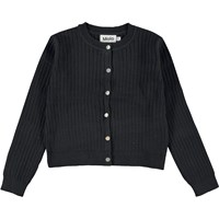 Schwarzer Strickcardigan mit langen Ärmeln. Dieser Strickcardigan besteht aus 100% Baumwolle, hat einen Rundhalsausschnitt mit schmaler Rippung, einen Knopfverschluss auf der Vorderseite, lange Ärmel mit Rippung, eine Rippung an der Hüfte und eine normale Passform. Verwenden Sie ihn als zusätzliche Schicht an kälteren Tagen oder zusätzlich zu einem Kleid für einen coolen Look.