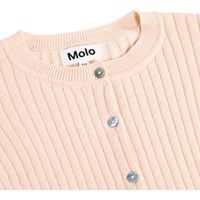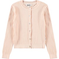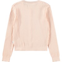Hellrosa Strickjacke aus weicher, biologischer Baumwollrippe. Die Strickjacke hat eine enge Passform und Knöpfe entlang der Vorderseite. Die Strickjacke hat feine gerippte Kanten an den Ärmeln, am Saum und am Hals, um einen eleganten Look zu verleihen.