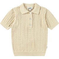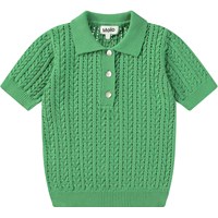 Grünes gestricktes T-Shirt aus weicher Öko-Baumwolle. Das T-Shirt verfügt über einen klassischen Kragen, gerippte Abschlüsse an den Ärmeln, am unteren Saum des T-Shirts und an der Knopfleiste, die drei Perlmuttknöpfe hat. Das T-Shirt ist in einem schönen Lochmuster gestrickt, was ihm einen exklusiven Look verleiht.