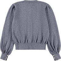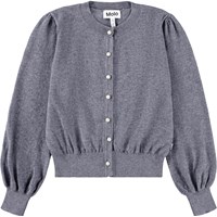 Schöner grauer Cardigan aus einer Mischung von Wolle und Baumwolle. Dieser Cardigan hat schöne Details mit großen Ballonärmeln und Perlknöpfen an den Ärmeln und entlang der gesamten Vorderseite. Breite Rippstrickbündchen an den Ärmeln und am Saum sowie gerippter Rand um den Hals.