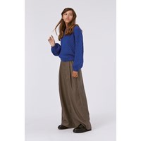 Blauer Strickpullover aus Popcorn-Strick. Dieser Strickpullover ist aus einer weichen und leichten Alpakawolle/Acryl-Mischung gefertigt, hat einen Rundhalsausschnitt mit Rippbündchen, lange Ärmel mit Rüschen und Rippbündchen am Ende, Rippbündchen an der Hüfte und eine lockere Passform. Der perfekte Alltagsstrick mit Kante.