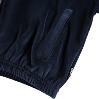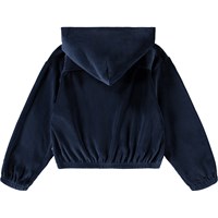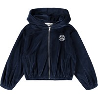 Dunkelblaues Velours-Hoodie mit Reißverschluss. Das Hoodie hat eine kleine weiße bestickte Blume auf der Brust, eine lockere Passform und gerippte Abschlüsse. Kombinieren Sie es mit der passenden Hose für einen kompletten Look.