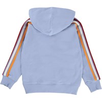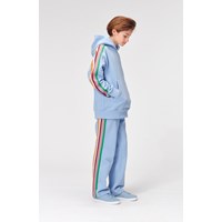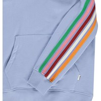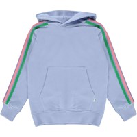 Madelyn ist ein blauer Hoodie mit einer Kängurutasche auf der Vorderseite sowie bunten Streifen an den Ärmeln. Kombinieren Sie die Bluse mit der passenden Hose.