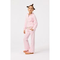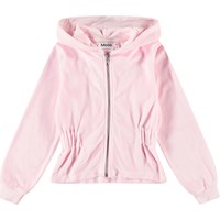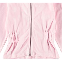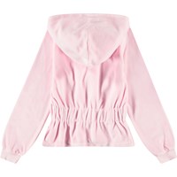 Pinkes Velours-Strickjacke mit Kapuze, gerippten Bündchen an den Ärmeln und einem breiten Gummizug an der Taille, der der Strickjacke eine kuschelige Passform verleiht.