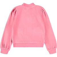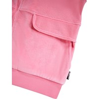 Rosa Strickjacke aus weichem Velours. Die Strickjacke hat einen Reißverschluss, Taschen an der Seite mit detaillierten Taschenklappen, Raffungen an den Schultern und einen breiten gerippten Saum an den Ärmeln und der Taille. Kombinieren Sie die Strickjacke mit der passenden Hose für ein komplettes und bequemes Velours-Set.