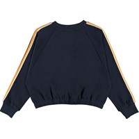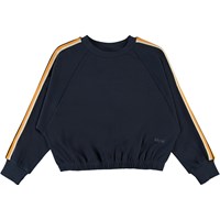 Malika ist ein dunkelblaues Sweatshirt mit gestreiften Bändern an den Ärmeln. Das Sweatshirt hat Raglanärmel und eine kurze Passform. Kombiniere das Sweatshirt mit passender Hose. Ecocert Greenlife, certifikationsnr. 197496
