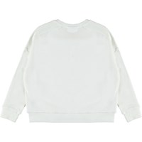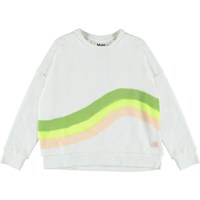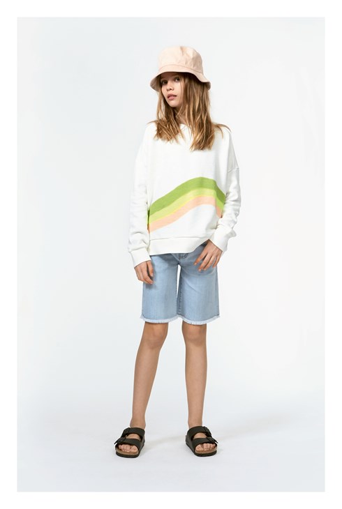 Mandy ist ein weißes oversize Sweatshirt mit Regenbogenmuster auf der Vorderseite. Das Sweatshirt hat Raglanärmel.
