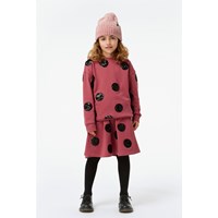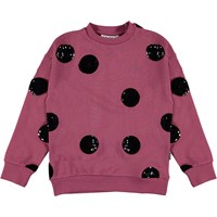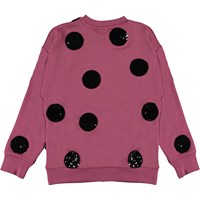 Manon ist ein himbeerfarbenes Sweatshirt mit großen Bomben aus schwarzen Pailletten. Die Bluse hat drop-down Schultern, sowie unten, am Ärmelende und am Hals eine Rippkante. Kombinieren Sie die Bluse mit dem passenden Rock.