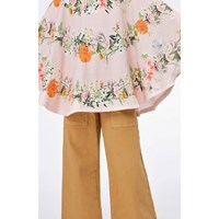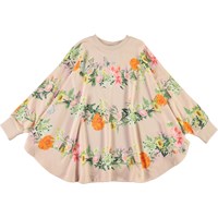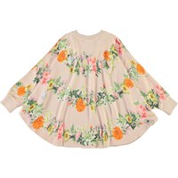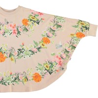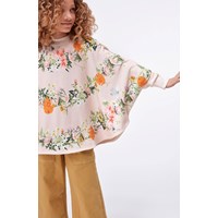 Marcella ist ein rosa Poncho mit Druck von Blumenreben und feinen Schmetterlingen. Die Größen entsprechen: S = 2-4 Jahre M = 5-7 Jahre und L = 8-12 Jahre.