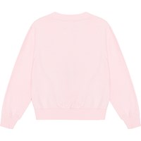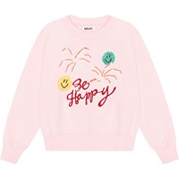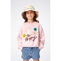 Rosafarbenes Sweatshirt aus Öko-Baumwolle mit zwei kleinen Paillettenstickereien mit lächelnden Gesichtern, Palmenaufdruck und dem Text „Be Happy“ auf der Vorderseite. Das Sweatshirt hat eine normale Passform, einen Rundhalsausschnitt mit gerippten Abschlüssen, Bündchen und Saum.