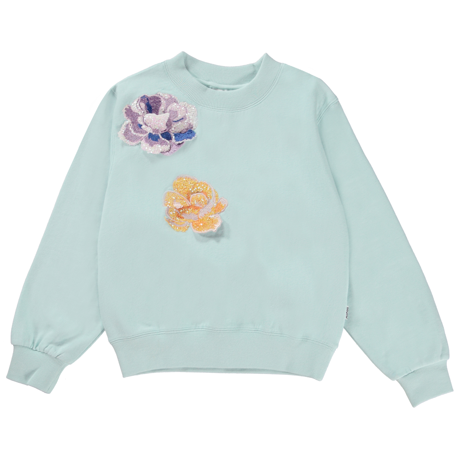 Marge ist ein hellblaues Sweatshirt aus 100 % Öko-Baumwolle. Die Bluse ist an Hals, Handgelenken und Hüften gerippt und mit floralen Patches mit Pailletten aufgenäht.