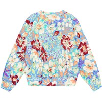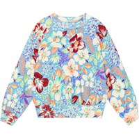 Blau-lila Sweatshirt aus Öko-Baumwolle mit mehrfarbigem Allover-Blumenprint. Das Sweatshirt hat einen Rundhalsausschnitt, Rippbündchen an Hals, Saum und Ärmeln sowie eine übergroße Passform.