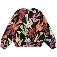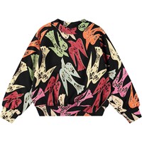 Schwarzes Sweatshirt aus Öko-Baumwolle mit rundem Ausschnitt und geripptem Abschluss am Ausschnitt, am Saum und an den Ärmeln. Das Sweatshirt hat eine übergroße Passform und einen künstlerischen Druck von mehrfarbigen Schwalben in dunklen und hellen Farben, was einen frischen und lebendigen Ausdruck verleiht.