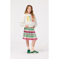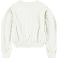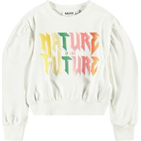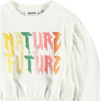 Weißes Cropped-Sweatshirt aus weicher Baumwolle mit gerippten Kanten am Hals, an den Ärmeln und am unteren Saum des Sweatshirts. Das Sweatshirt hat eine lockere Passform, weite Armlöcher mit Raffungen und eine bunte Stickerei auf der Vorderseite mit dem Text 'Nature Is The Future'.