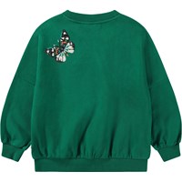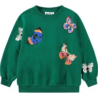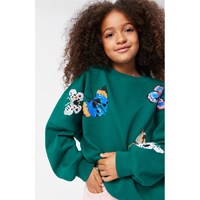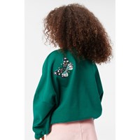 Flaschengrünes Sweatshirt aus weicher Öko-Baumwolle mit ungebürstetem Innenfutter, das an heißen Tagen angenehm kühl ist. Das Sweatshirt hat eine lockere Passform, einen Rundhalsausschnitt und gerippte Bündchen, einen gerippten Ausschnitt und einen gerippten Saum. Es ist außerdem mit mehrfarbigen Paillettenstickereien von wunderschönen Schmetterlingen in verschiedenen Farben und Formen verziert.