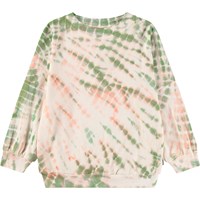 Grünes und pinkes Sweatshirt aus Bio-Baumwolle mit Rundhalsausschnitt und gerippten Kanten an den Ärmeln, am Hals und am Saum. Das Sweatshirt hat eine übergroße, lockere Passform mit einem einzigartigen Batikmuster. Bitte beachten Sie, dass alle unsere Batikmuster handgefertigt sind, wodurch ein einzigartiges Muster entsteht, das von Stil zu Stil variiert.