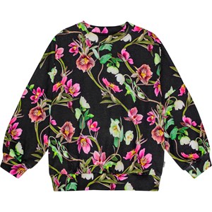 Schwarzes Sweatshirt aus weicher Öko-Baumwolle. Das Sweatshirt hat eine lockere Passform und einen Rundhalsausschnitt mit gerippten Kanten an den Ärmeln, am Ausschnitt und am Saum. Er verfügt über ein Allover-Print von Weihnachtsrosen in weißen und hellrosa Tönen, die sich wunderschön mit ihren grünen Blättern verflechten. Kombinieren Sie das Sweatshirt mit einem passenden Rock, um ein komplettes und bequemes Jersey-Set zu kreieren.